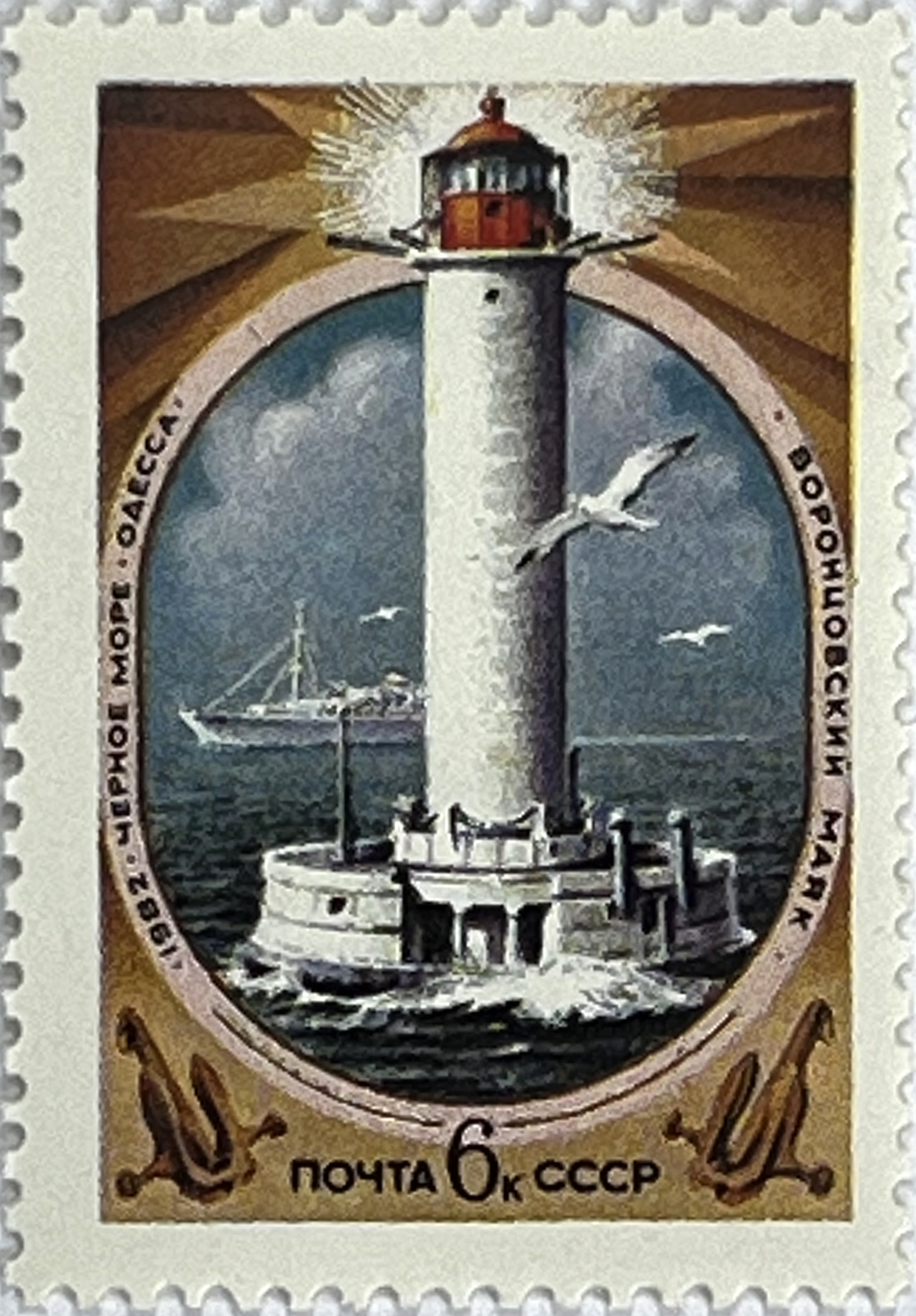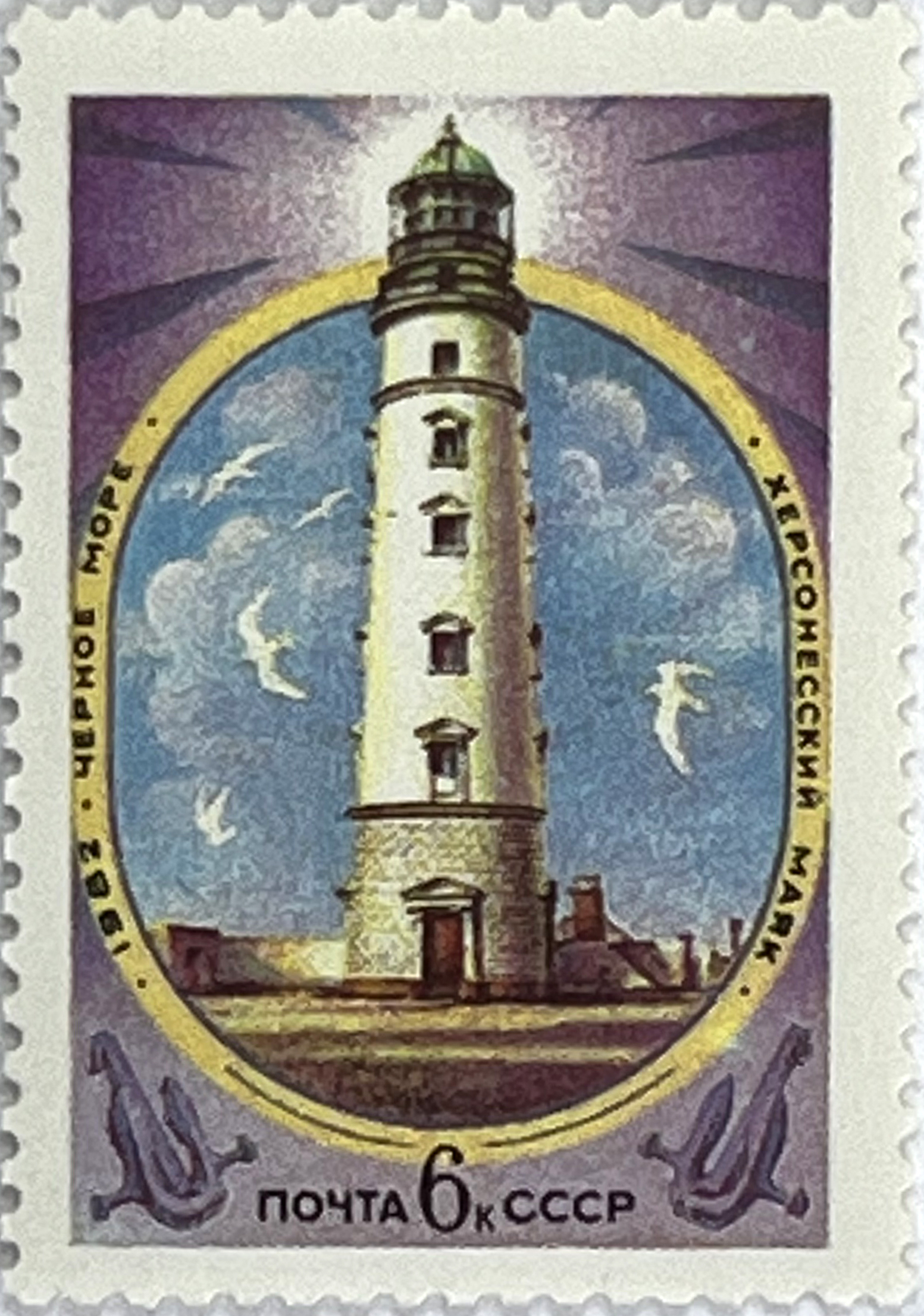 6 k: Novorossiysk Lighthouse (Black Sea) – a distinctive striped tower against a green background.