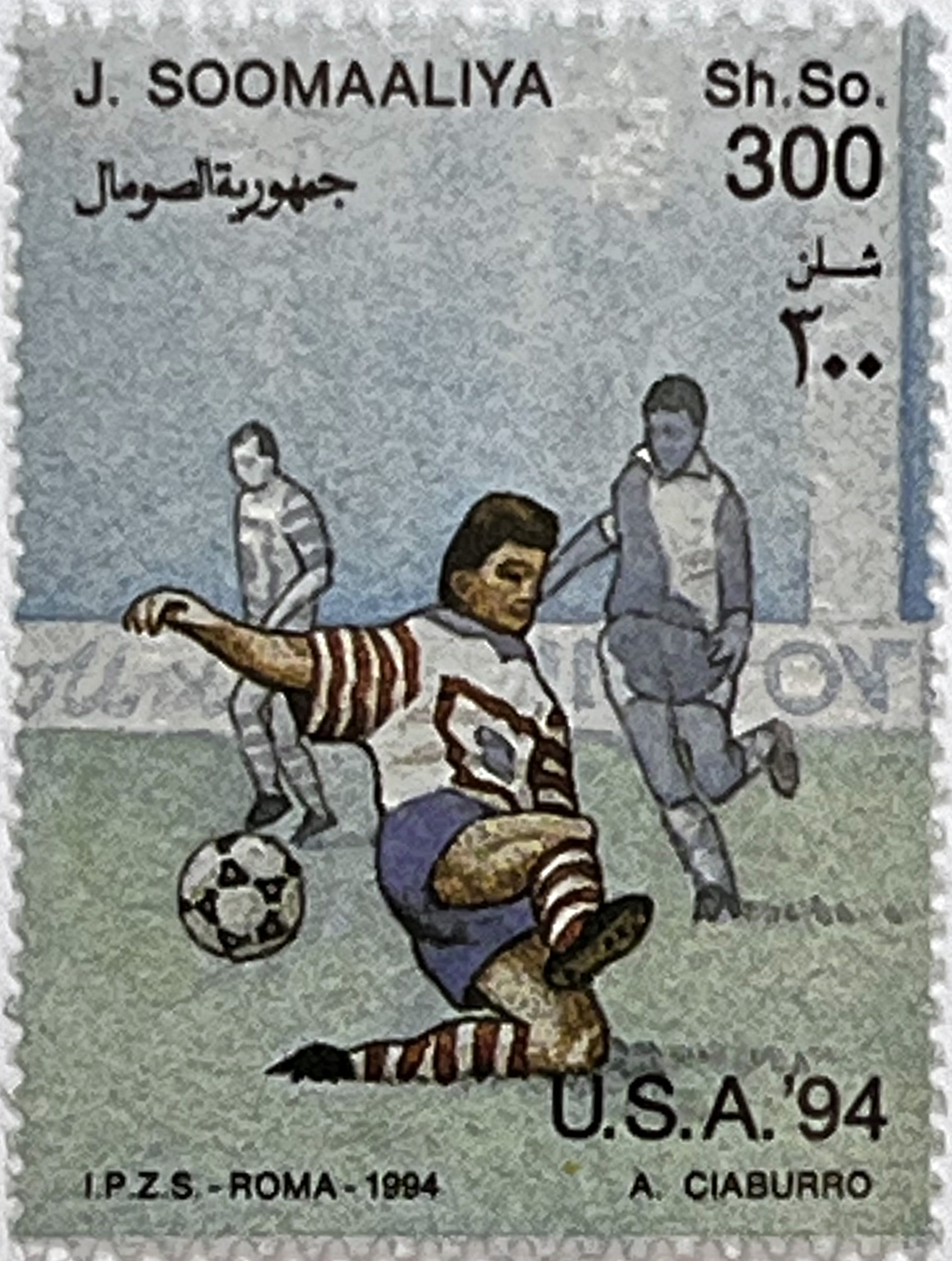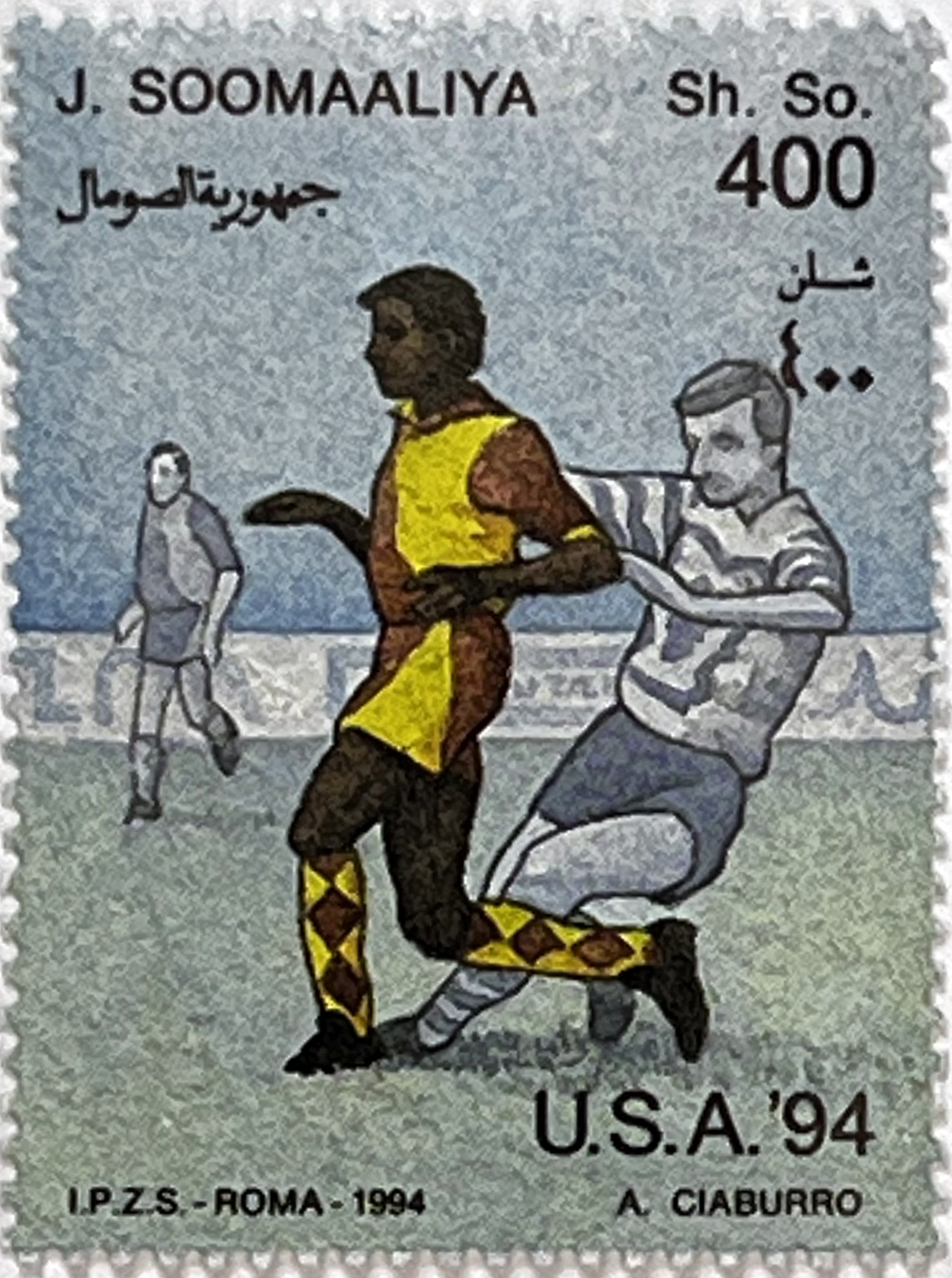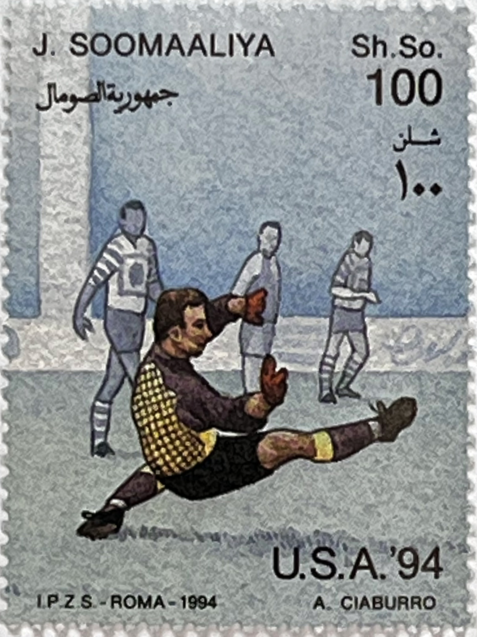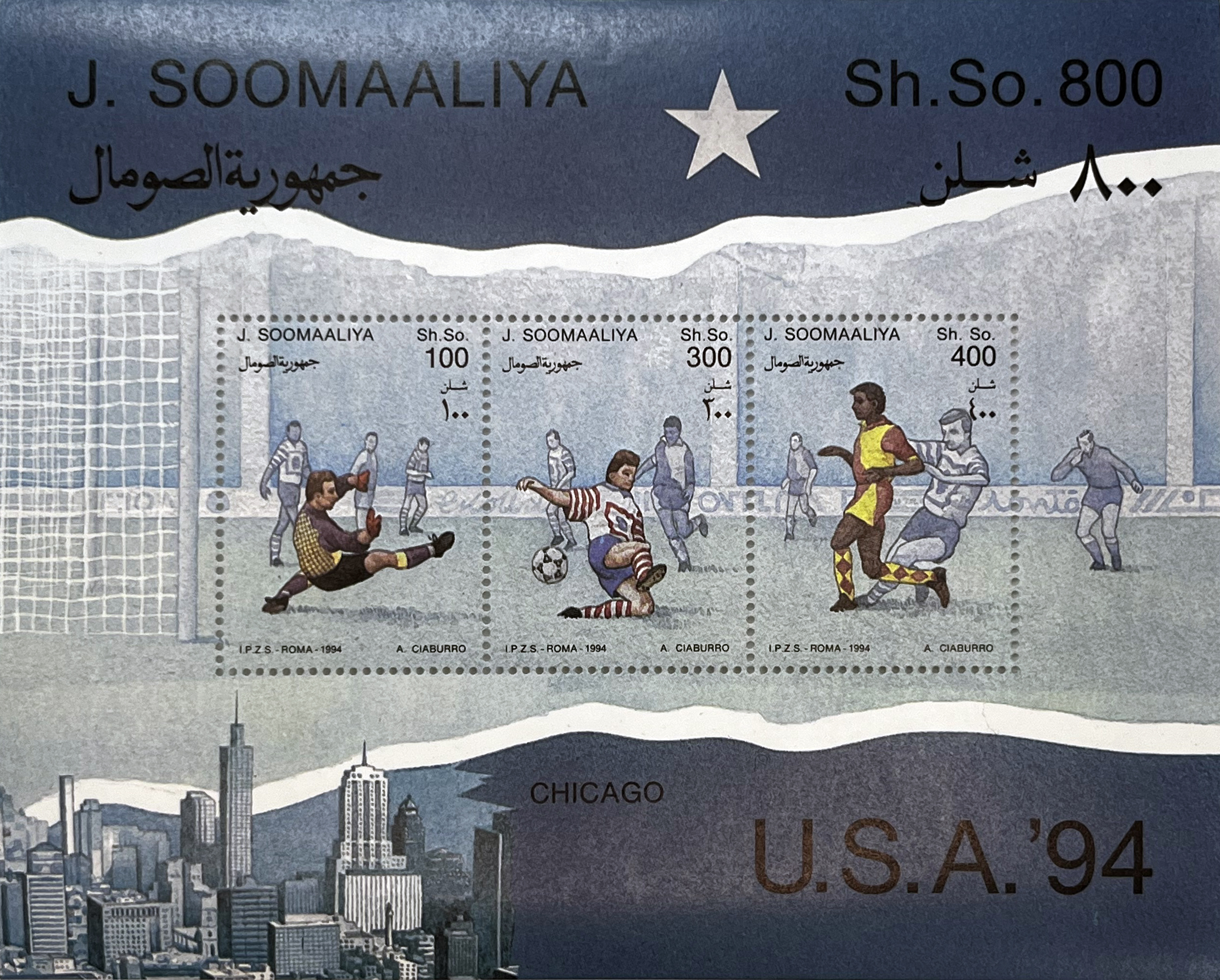 This 1994 sports issue pays tribute to one of the most significant football events of the decade. Designer A. Ciaburro focused on realism and action, depicting key moments of the game: a goalkeeper's save, a battle for possession, and offensive dribbling. The souvenir sheet features the Chicago skyline in the background, providing an authentic American atmosphere.