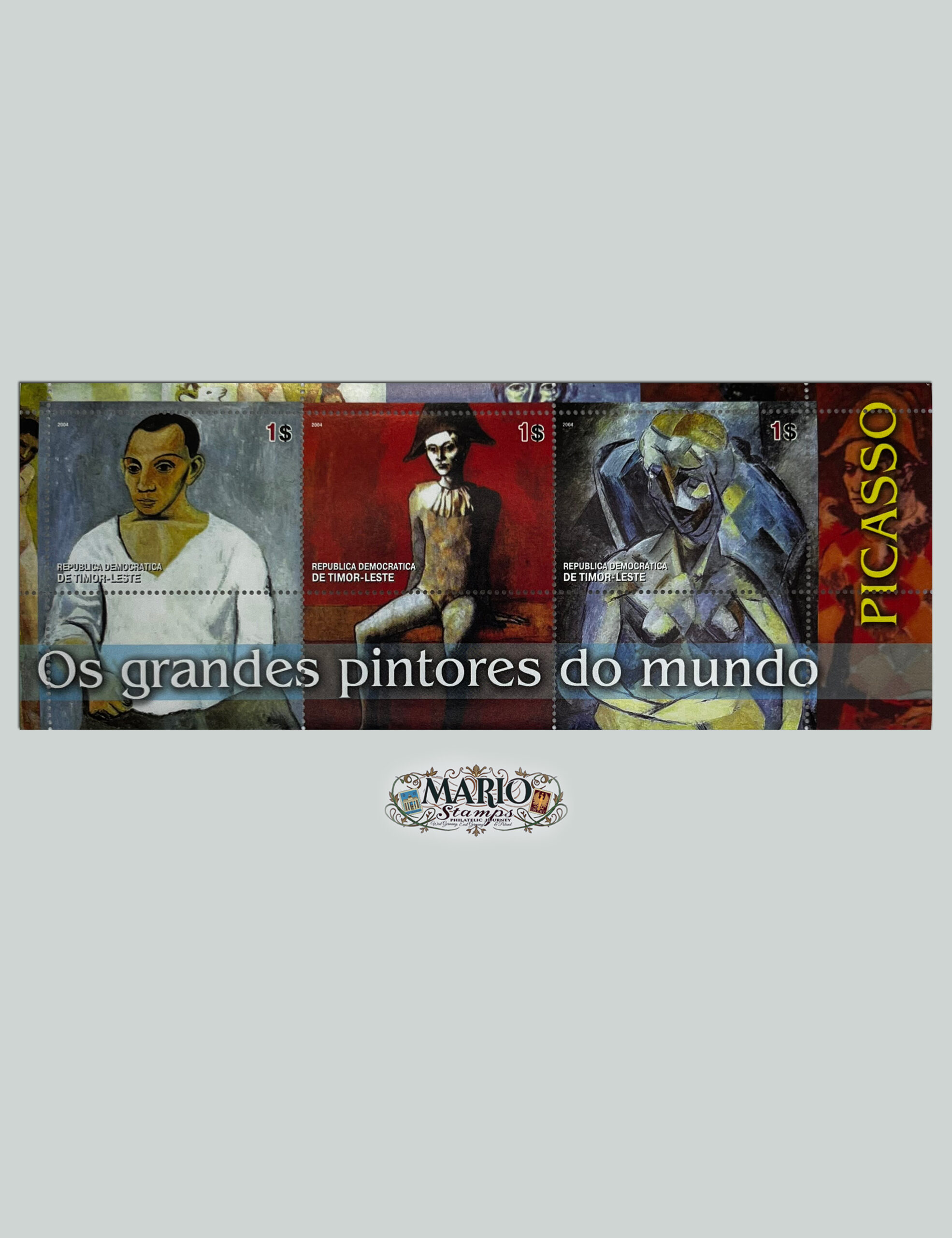 A striking sheet from the "Os grandes pintores do mundo" series, featuring the iconic works of Pablo Picasso. The sheet's graphics flow seamlessly across the stamps, creating a cohesive composition that showcases the evolution of the master's style – from the Blue and Rose periods to mature Cubism. A must-have for any art-themed collection.