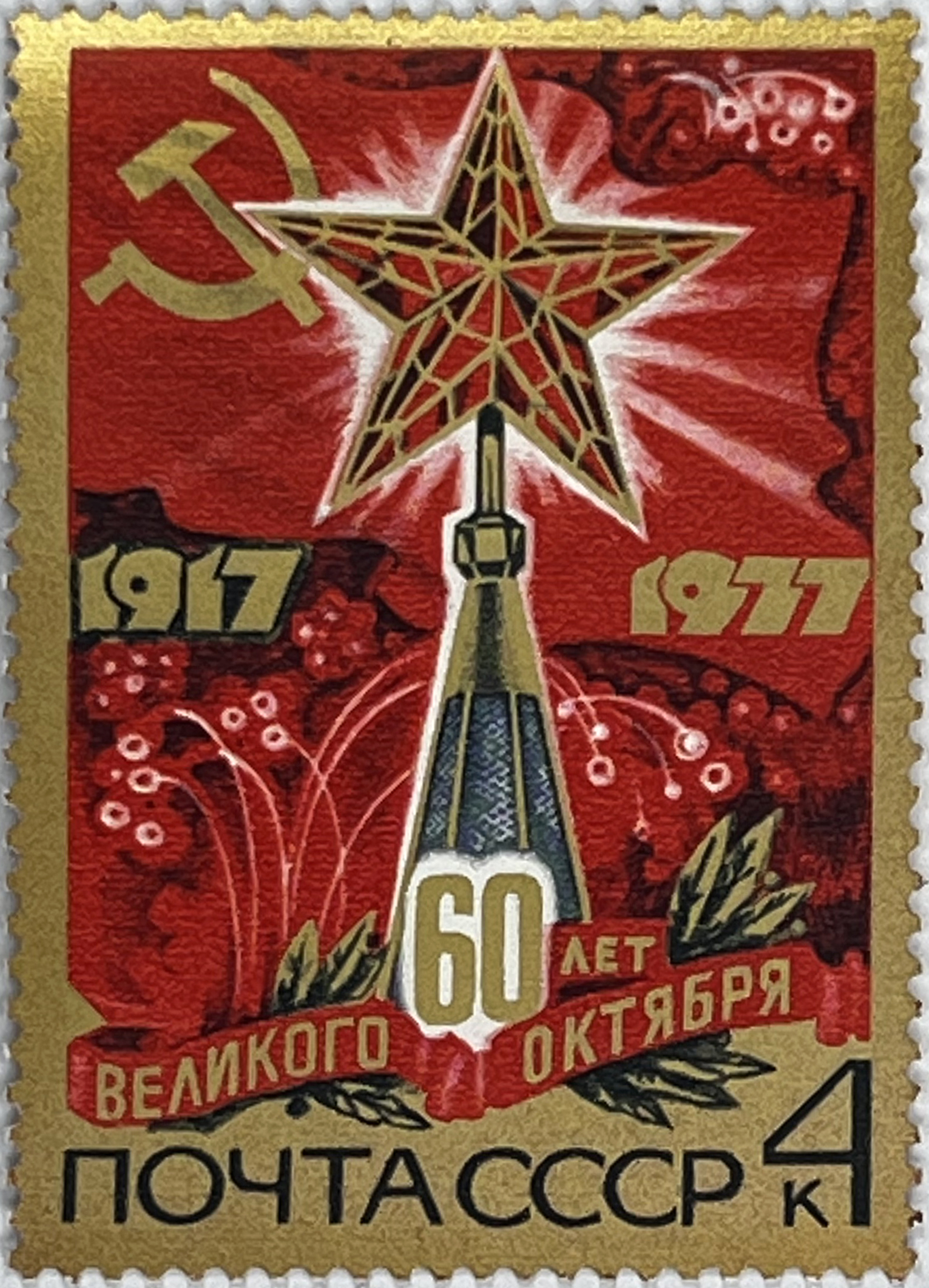 This monumental 1977 series commemorates six decades since the events of 1917. Each 4 k value depicts key state and historical symbols of the USSR, presented in the dynamic propaganda style of the era. The golden embellishments and bold "1917–1977" dates lend a particularly solemn character to the series.