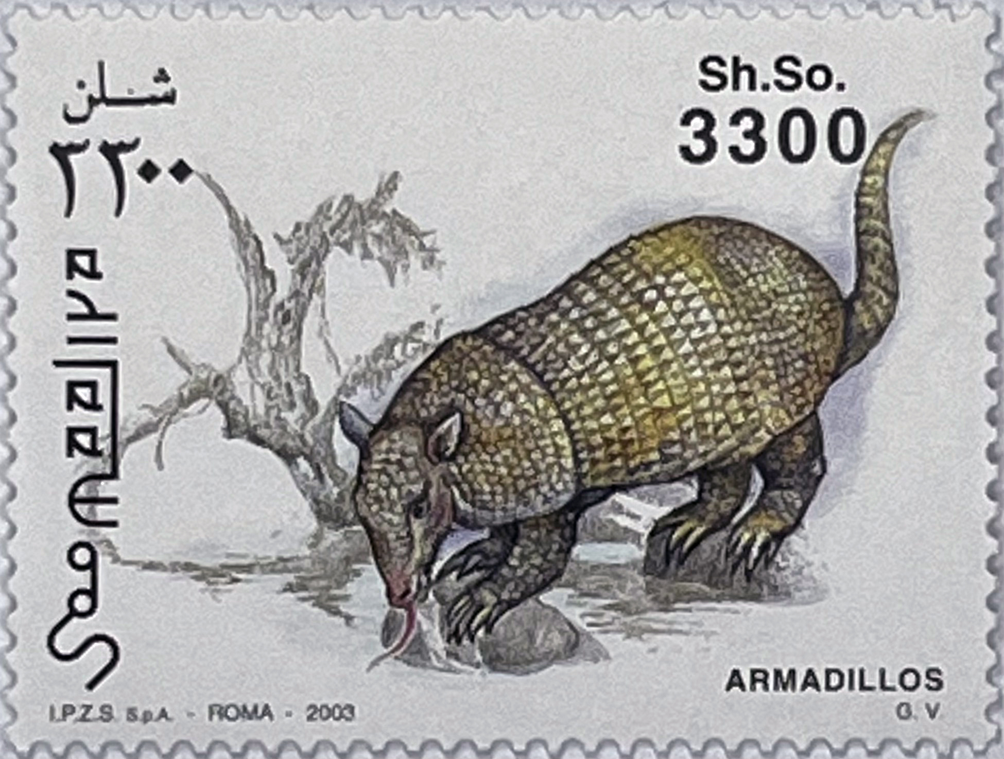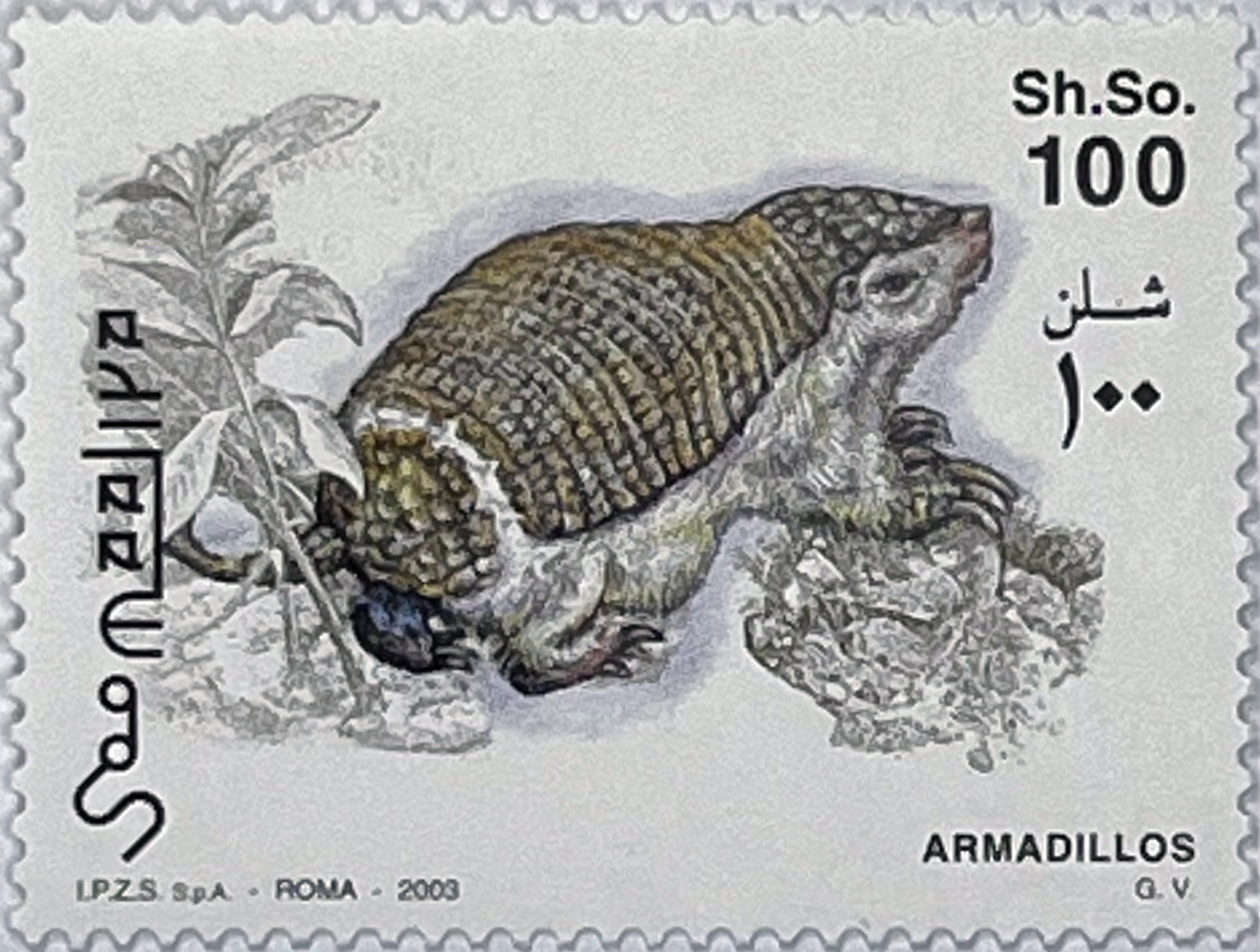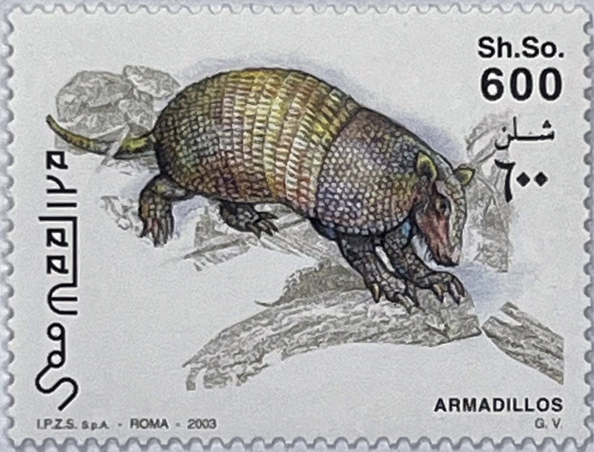 • 4 Single Stamps: Values of 100, 200, 600, and 3300 Sh. So. The stamps depict various species of armadillos in their natural, rocky, and dry environment. The details of the armor and the texture of the ground are rendered with great precision.