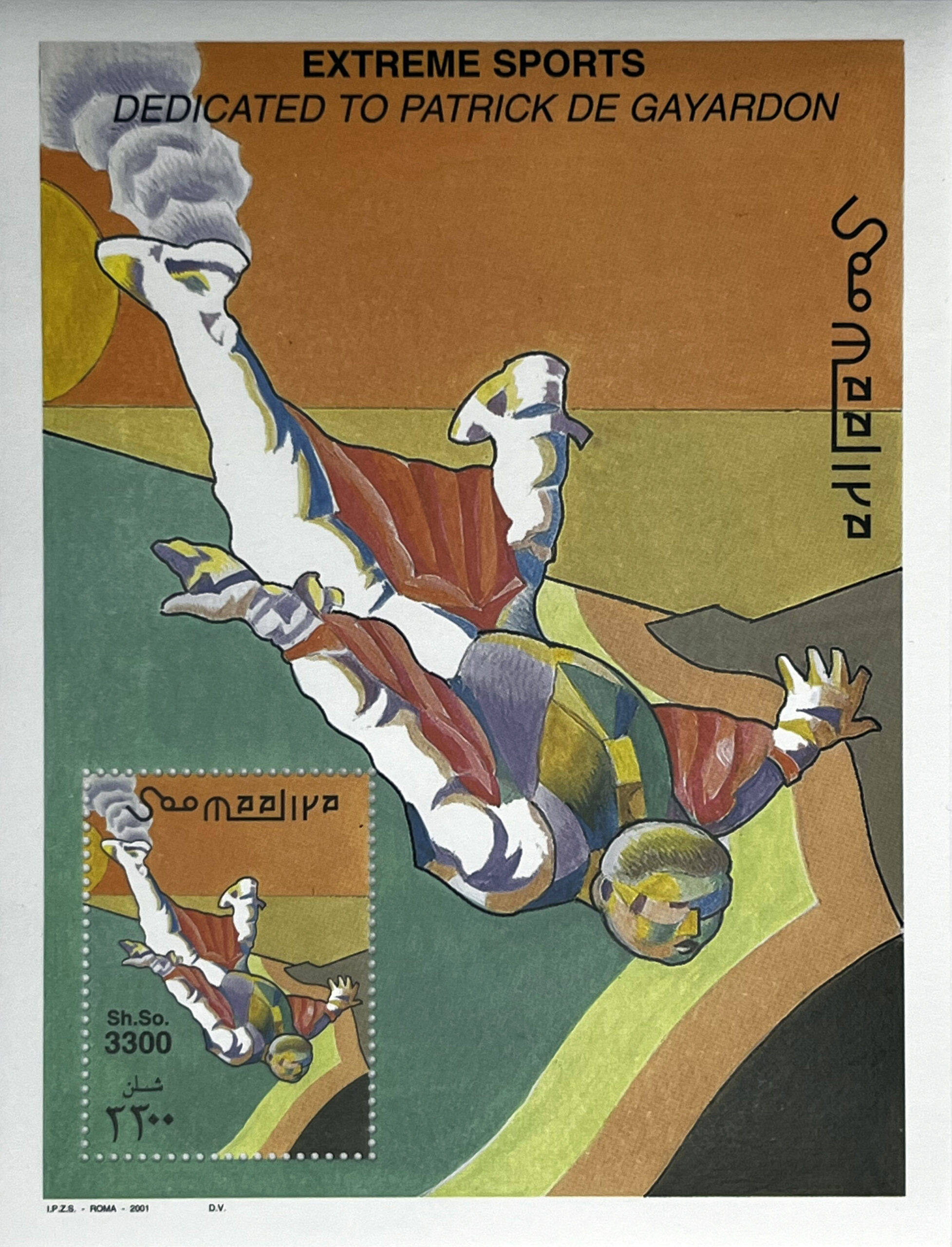 I am offering an extremely dynamic philatelic set from Somalia from 2001. This series pays tribute to courage and human potential, dedicated to the legendary pioneer of wingsuit jumping and skydiving – Patrick de Gayardon. The stamps are characterized by a modern, almost cubist style and vivid colors.