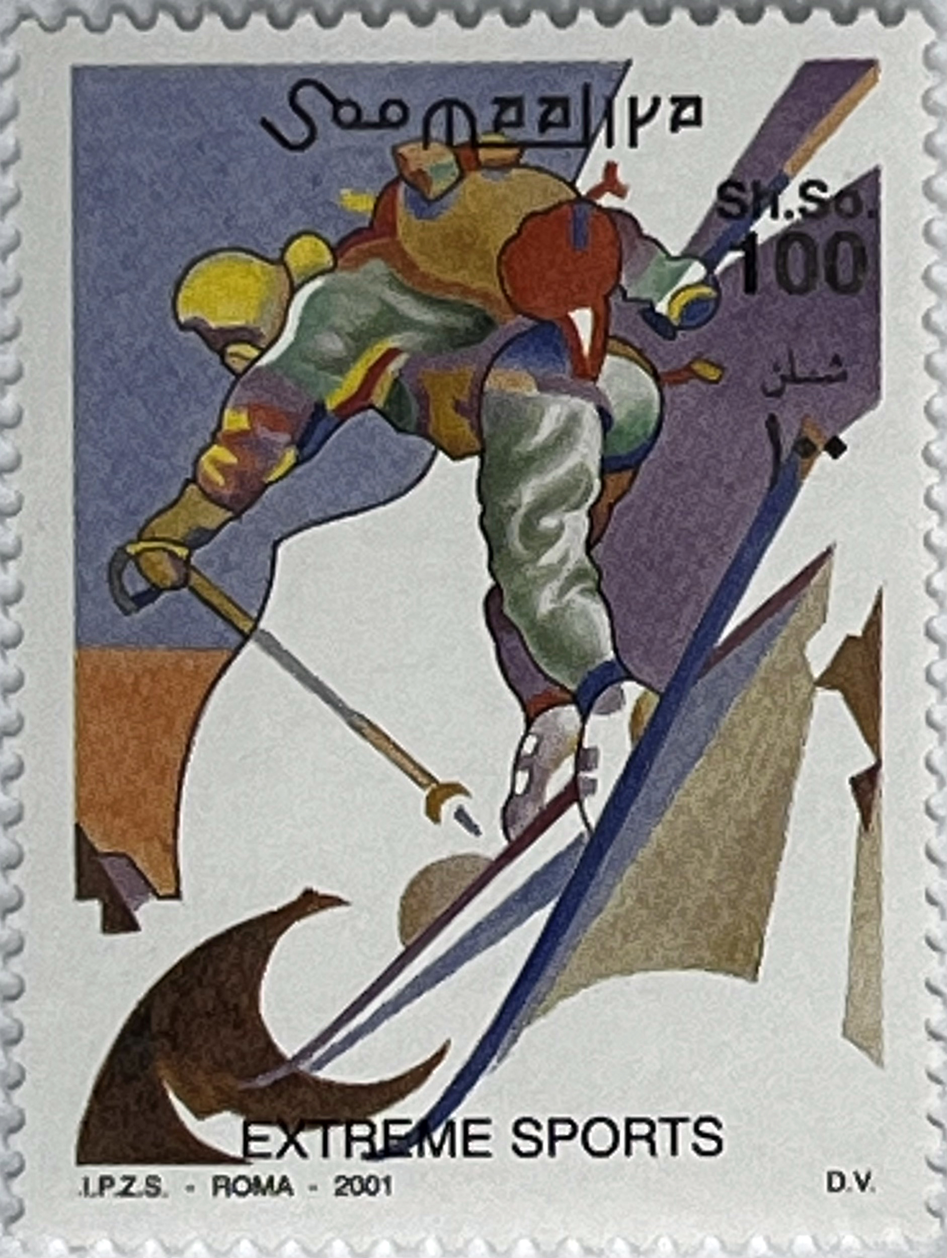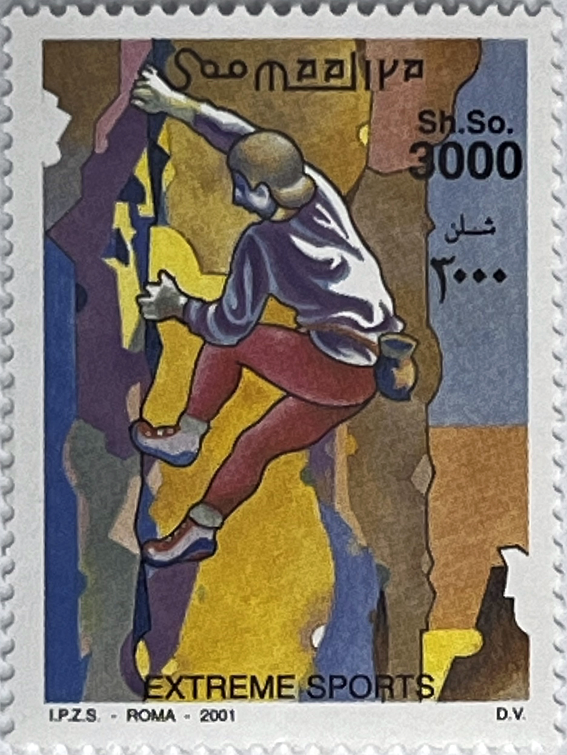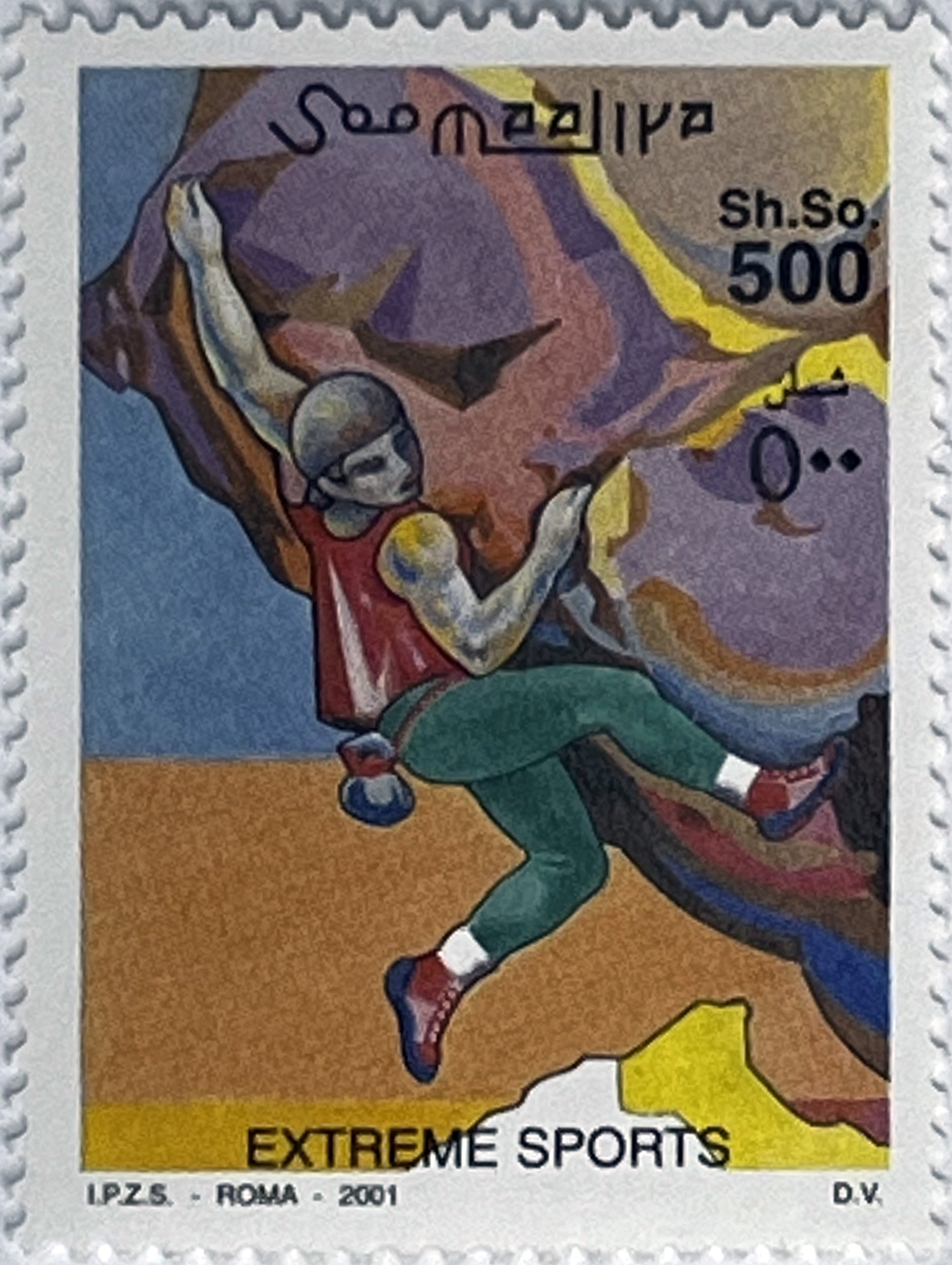 3 Single Stamps: Values of 100, 500, and 3000 Sh. So. They depict extreme sports enthusiasts in action: high-altitude skiing/freeriding on steep slopes and rock climbing. Each stamp is a small work of art depicting man's struggle with nature.