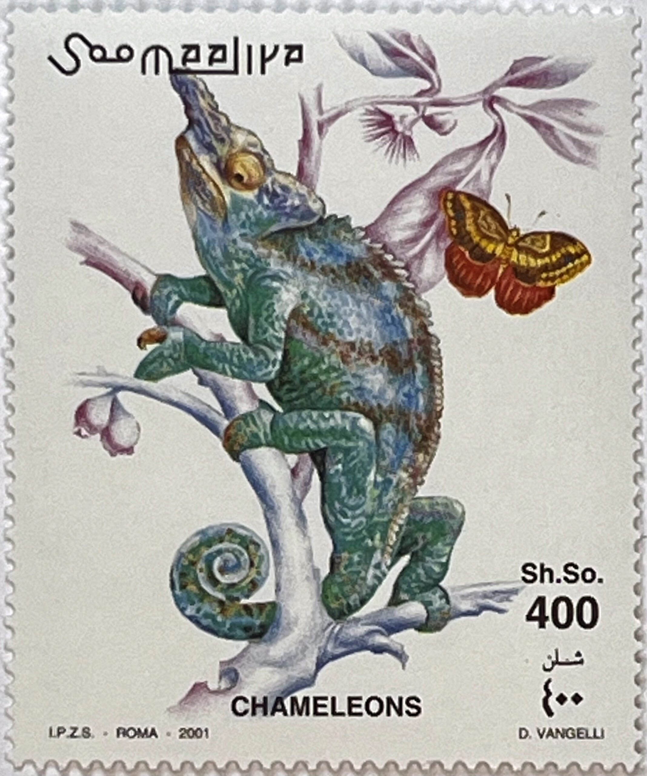 400 Sh. So.: A slender chameleon climbing a branch, accompanied by an orange butterfly.