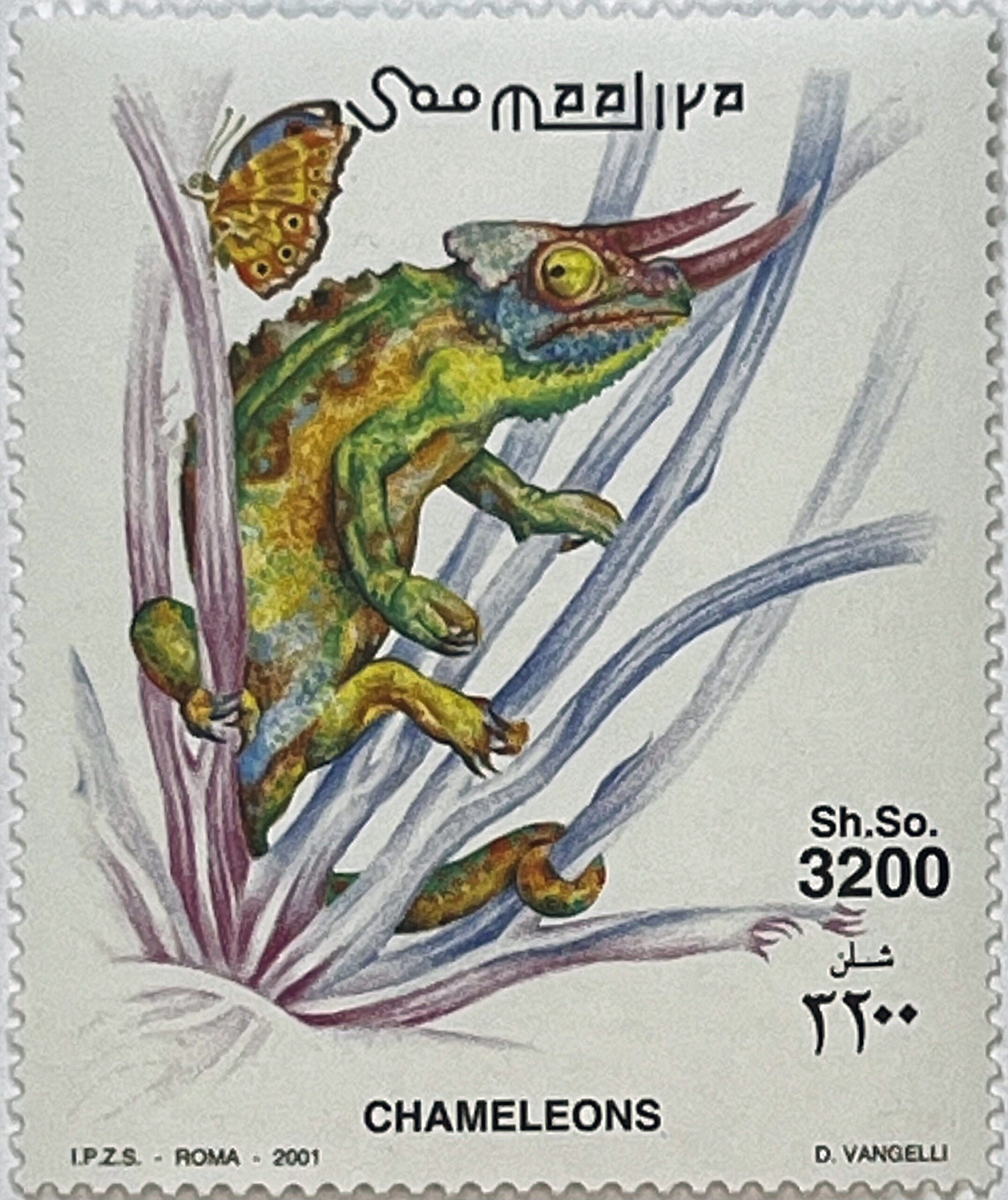 3200 Sh. So.: A Jackson's Chameleon with its characteristic horns, depicted in a dynamic pose against blue vegetation.