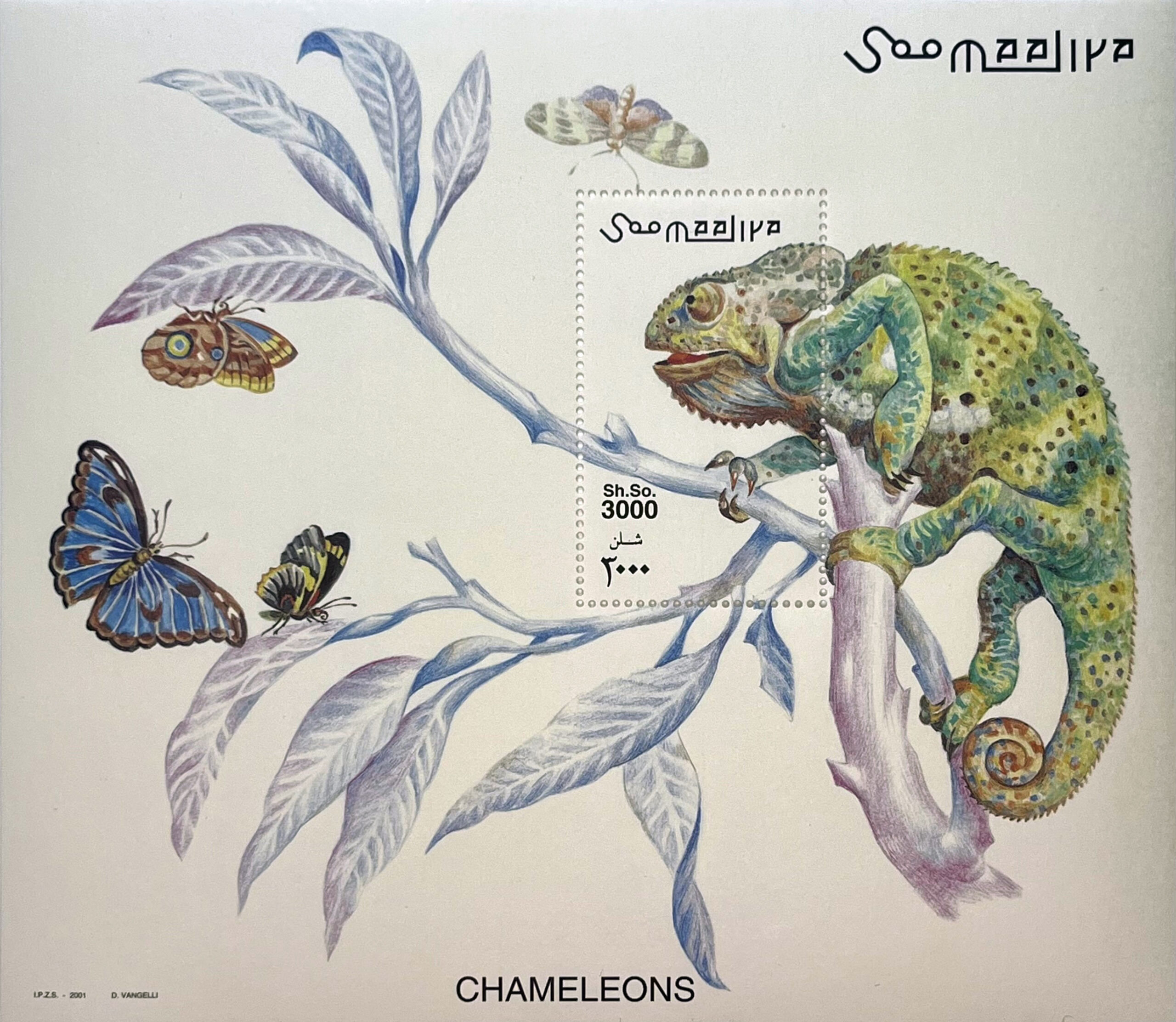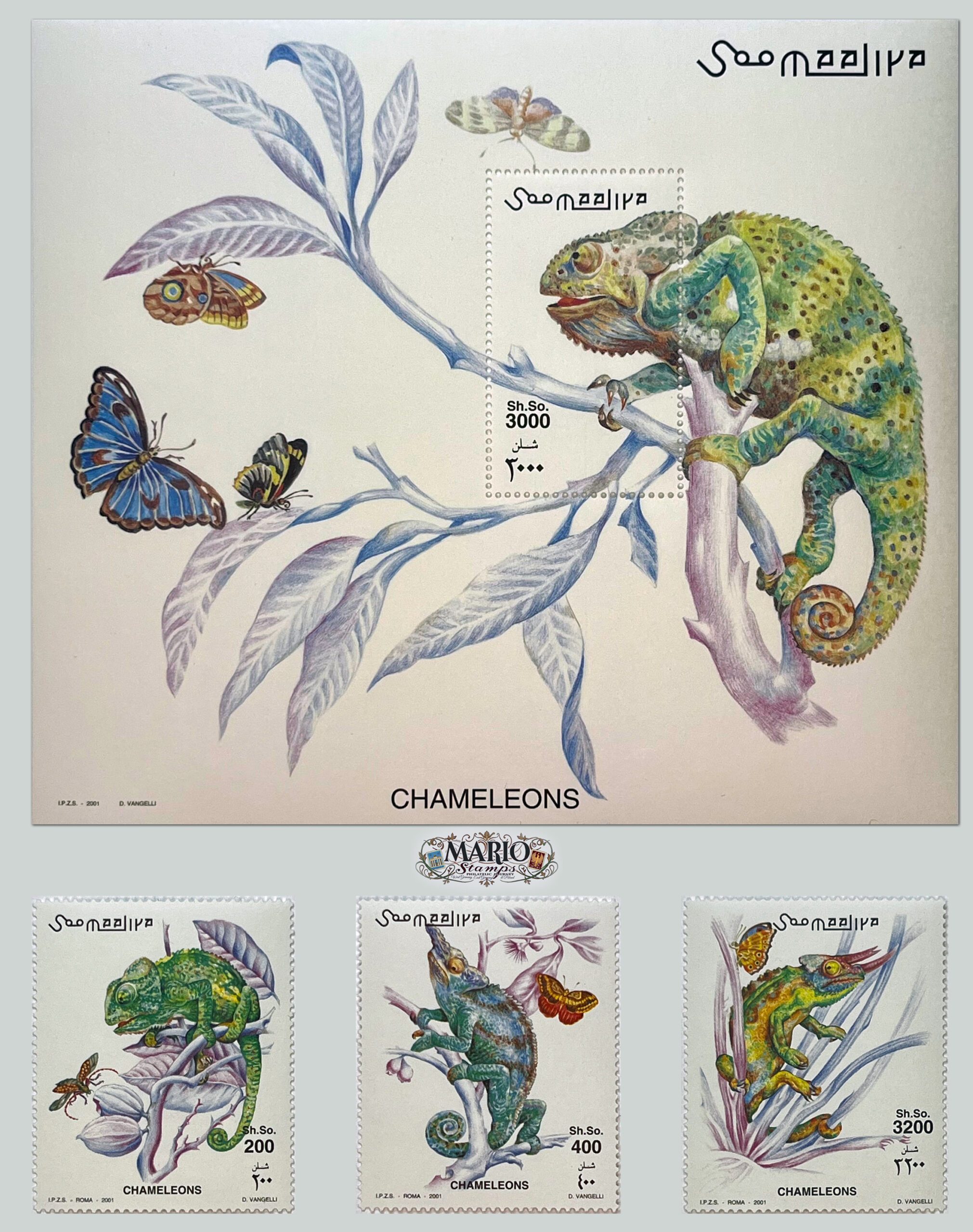 Souvenir Sheet (3000 Sh. So.): An impressive sheet featuring a large chameleon on a branch, surrounded by multicolored butterflies. The entire piece creates a harmonious, almost fairytale-like nature composition.