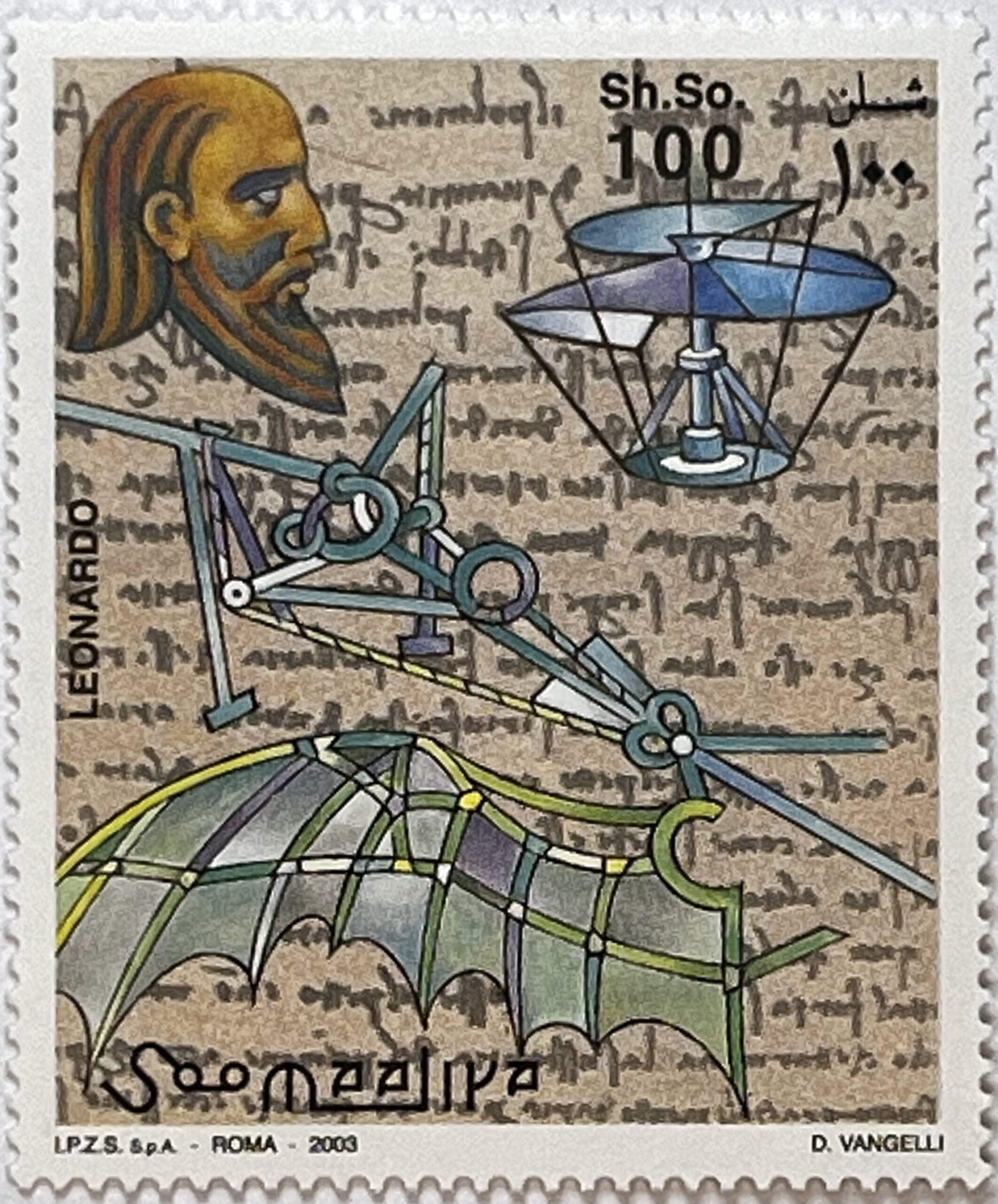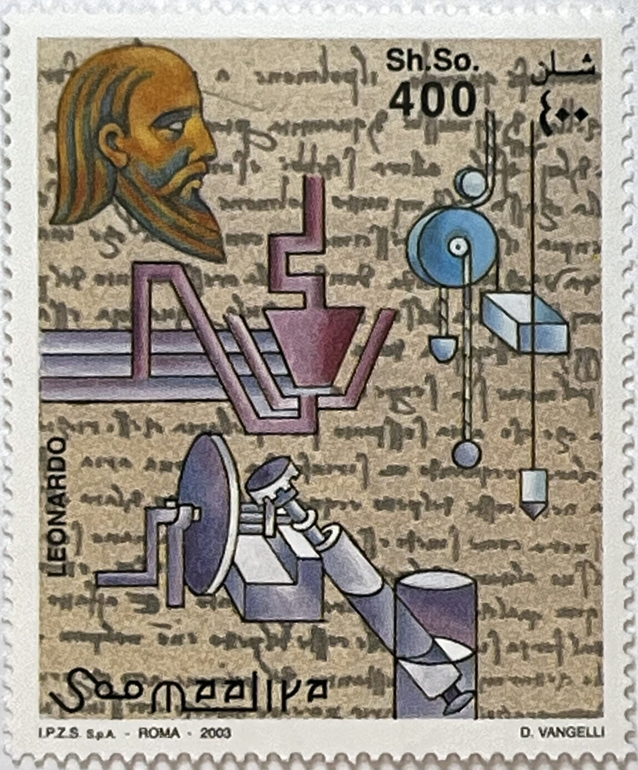 Bloczek (3200 Sh. So.): The centerpiece of the collection, featuring a monumental, modern interpretation of Leonardo’s equestrian monument design, integrated into multicolored mechanical forms. The iconic "aerial screw" sketch appears in the upper corner.