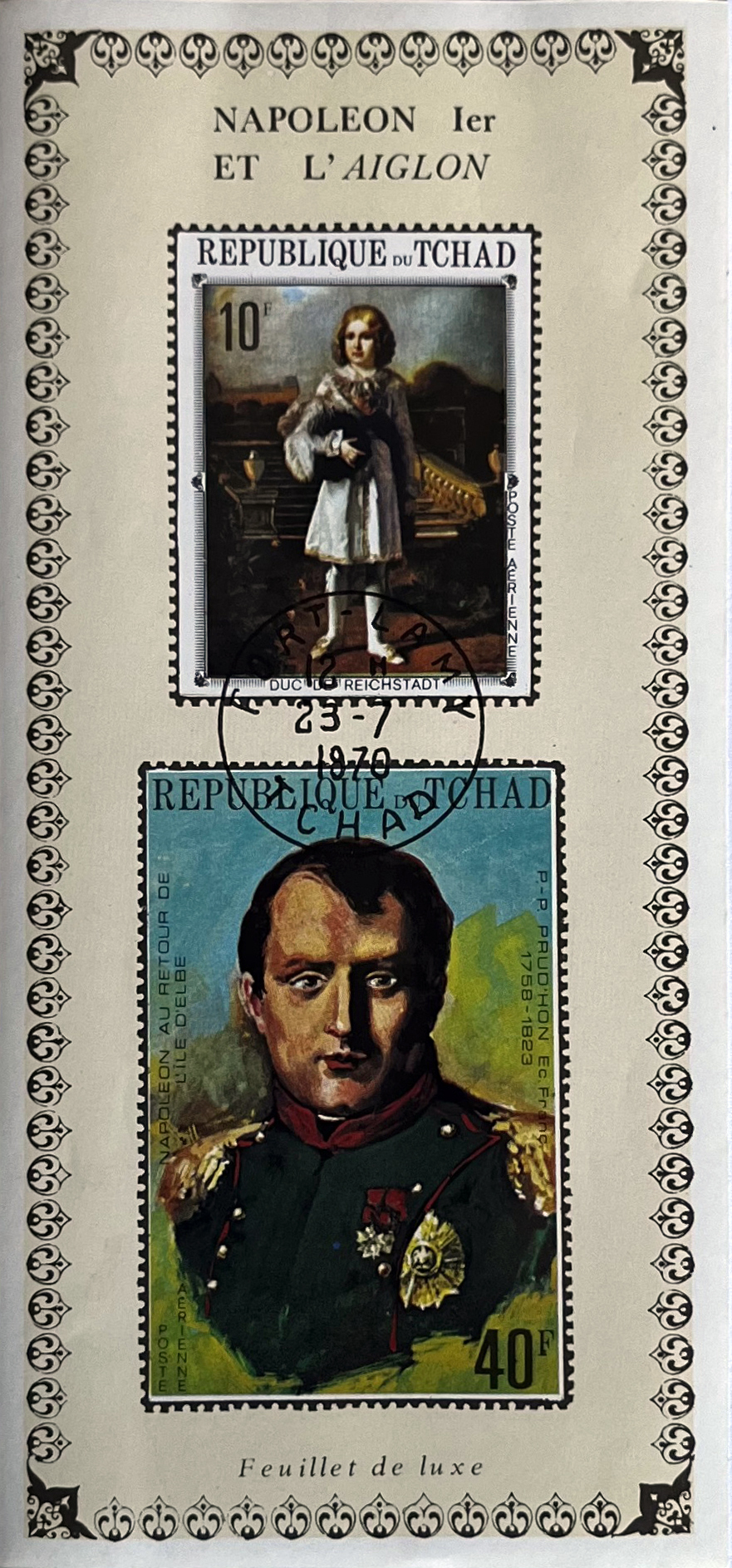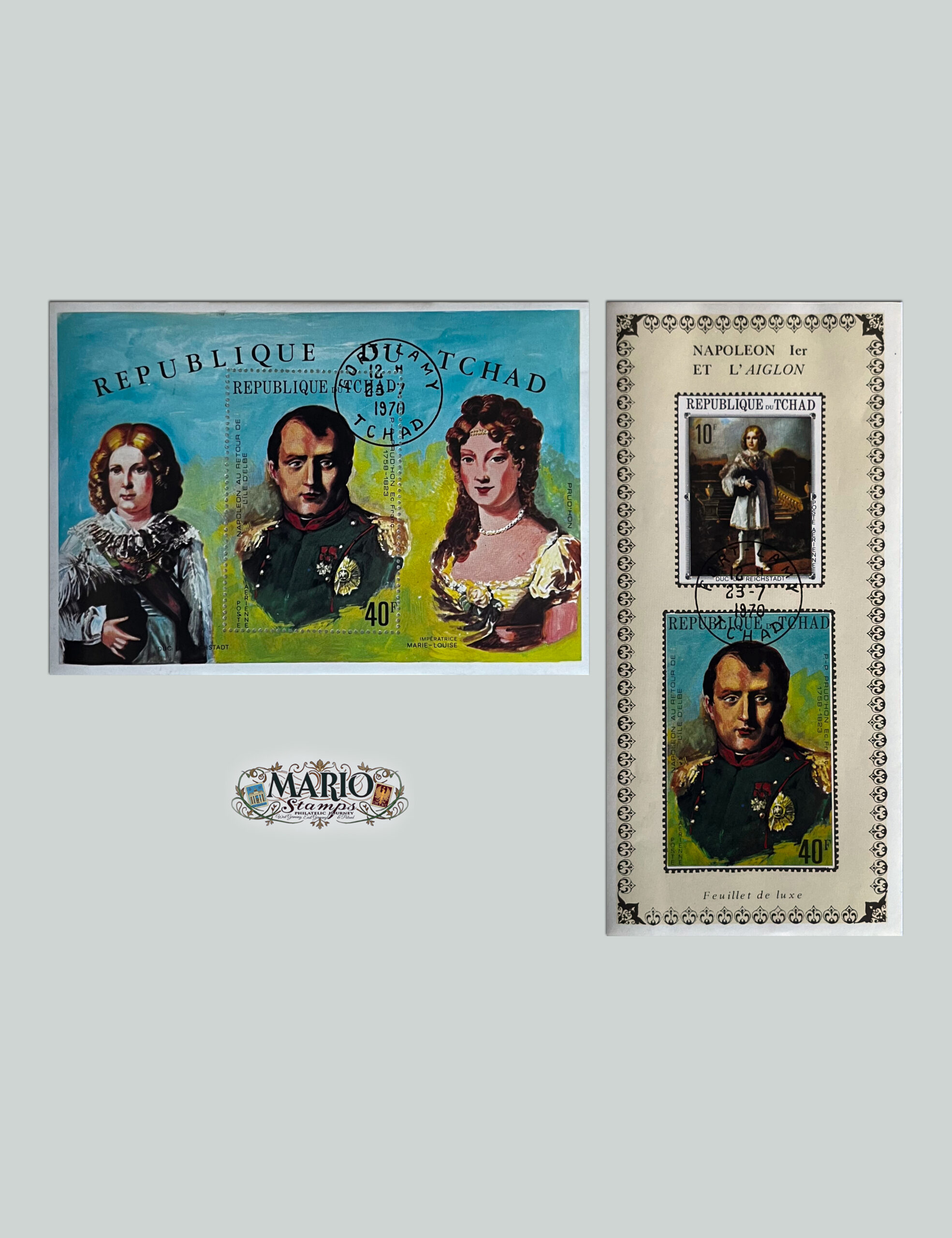 Zestaw dwóch unikatowych bloczków poświęconych Napoleonowi Bonaparte oraz jego synowi, Napoleonowi II (zwanemu „Orlątkiem”).