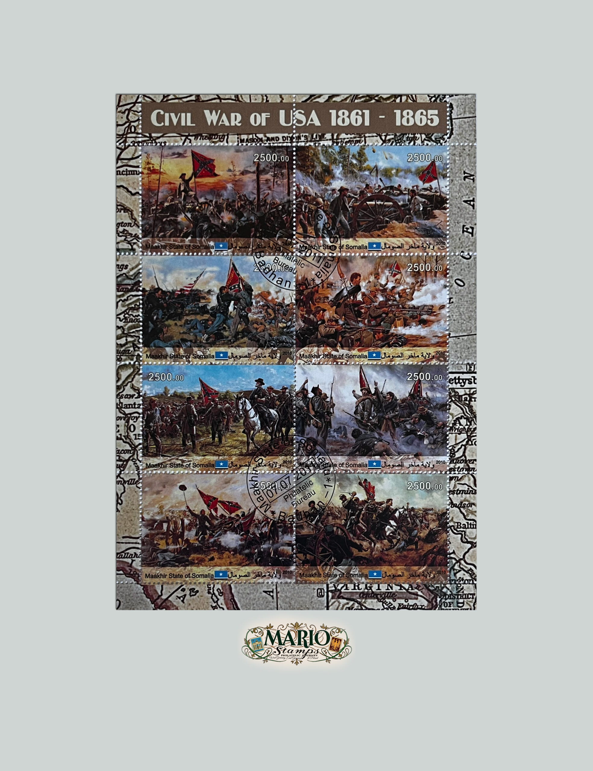 Ten efektowny arkusz to kolekcjonerskie wydanie upamiętniające historię Stanów Zjednoczonych. Przedstawia on kluczowe momenty wojny secesyjnej w formie dynamicznych obrazów batalistycznych. Należy zaznaczyć, że jest to wydanie o charakterze czysto kolekcjonerskim, a nie oficjalny znaczek pocztowy. Całość oprawiona jest w ozdobny margines stylizowany na starą mapę sztabową, co nadaje walorowi wyjątkowego klimatu.