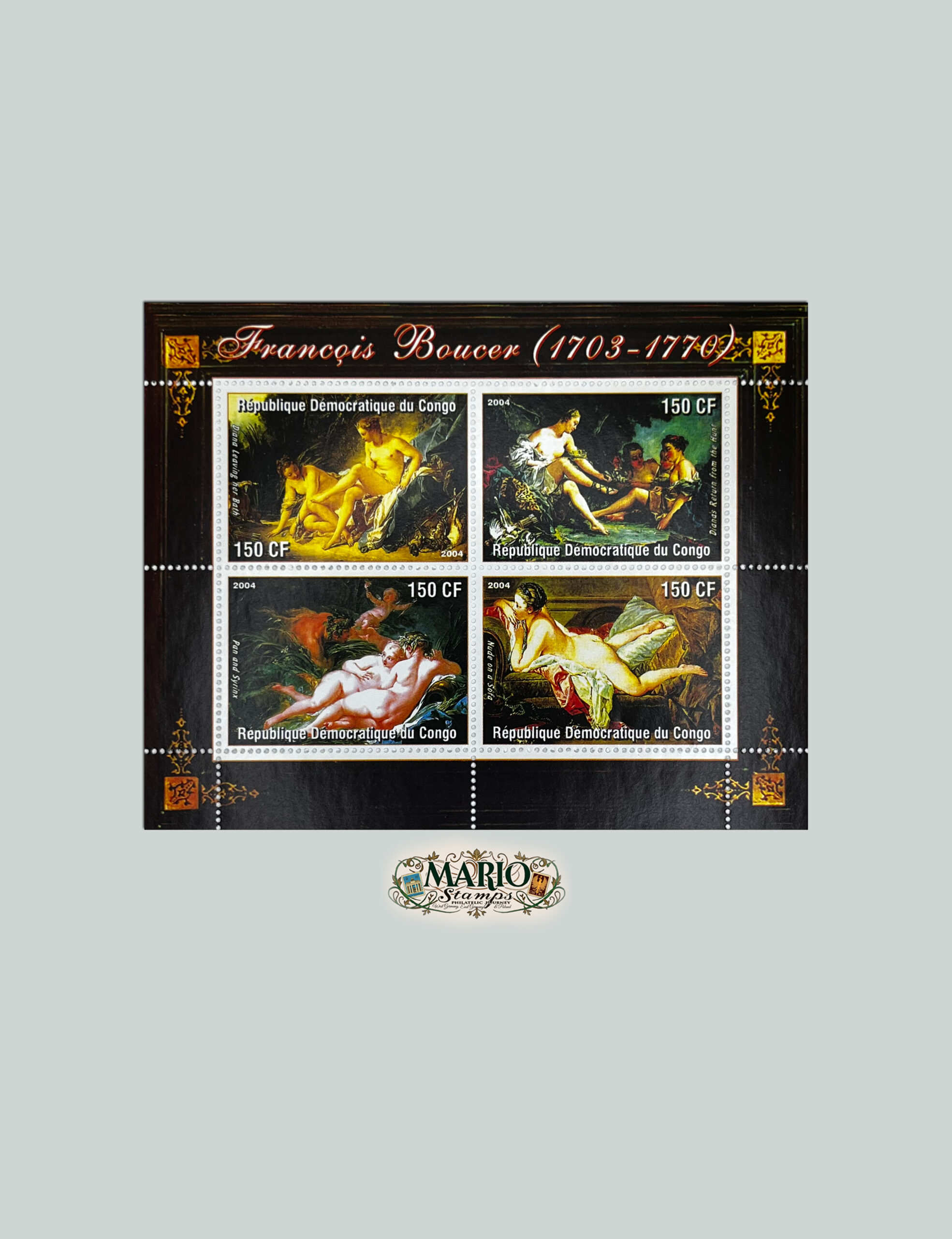 Ten efektowny arkusz to hołd dla twórczości François Bouchera, nadwornego malarza króla Ludwika XV. Należy zaznaczyć, że jest to wydanie o charakterze czysto kolekcjonerskim (tzw. „Cinderella”), które nie posiada autoryzacji oficjalnej administracji pocztowej i nie jest uznawane przez UPU. Każdy z czterech znaczków przedstawia inne słynne dzieło artysty, charakteryzujące się typową dla rokoka lekkością i wdziękiem.