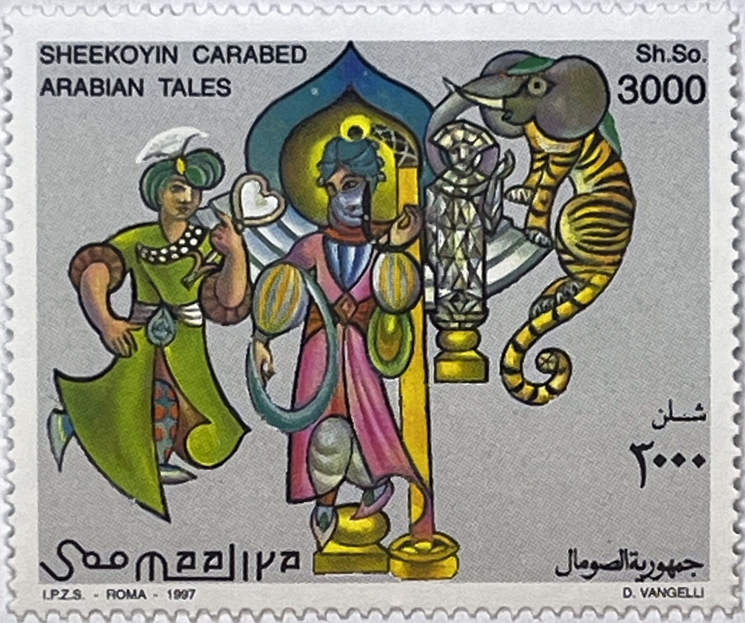 3000 Sh. So.: Postaci z magicznym lustrem w otoczeniu egzotycznych zwierząt – słonia i tygrysa.